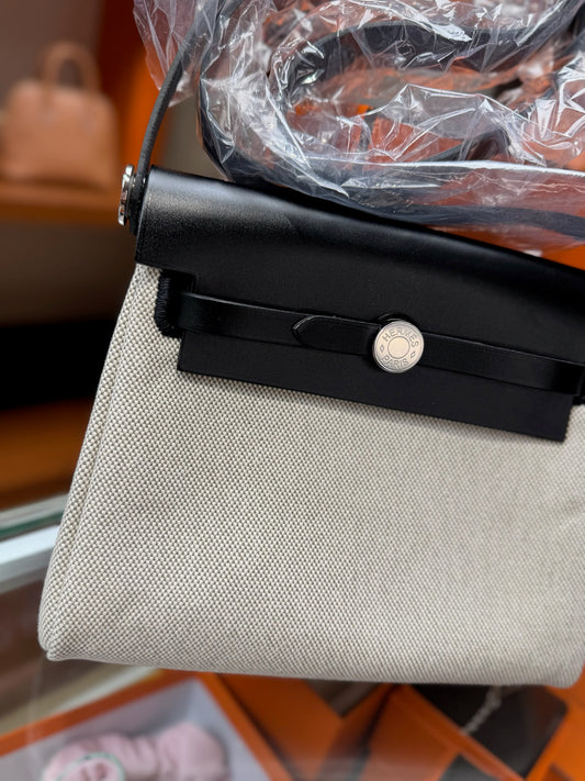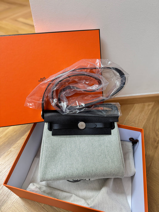 Hermes Mini Herbag Noir GHW 黑色銀扣 白併杏仁綠帆布